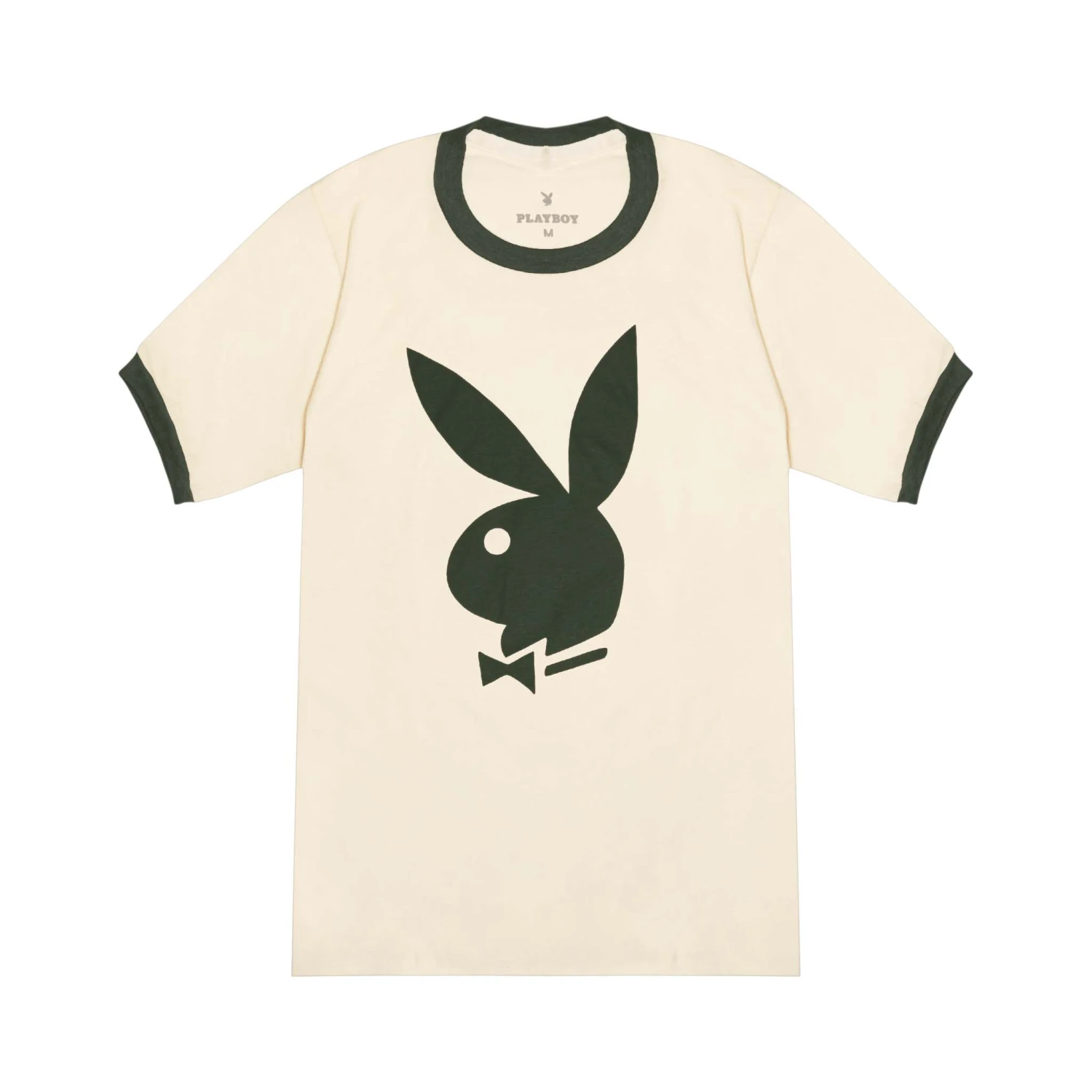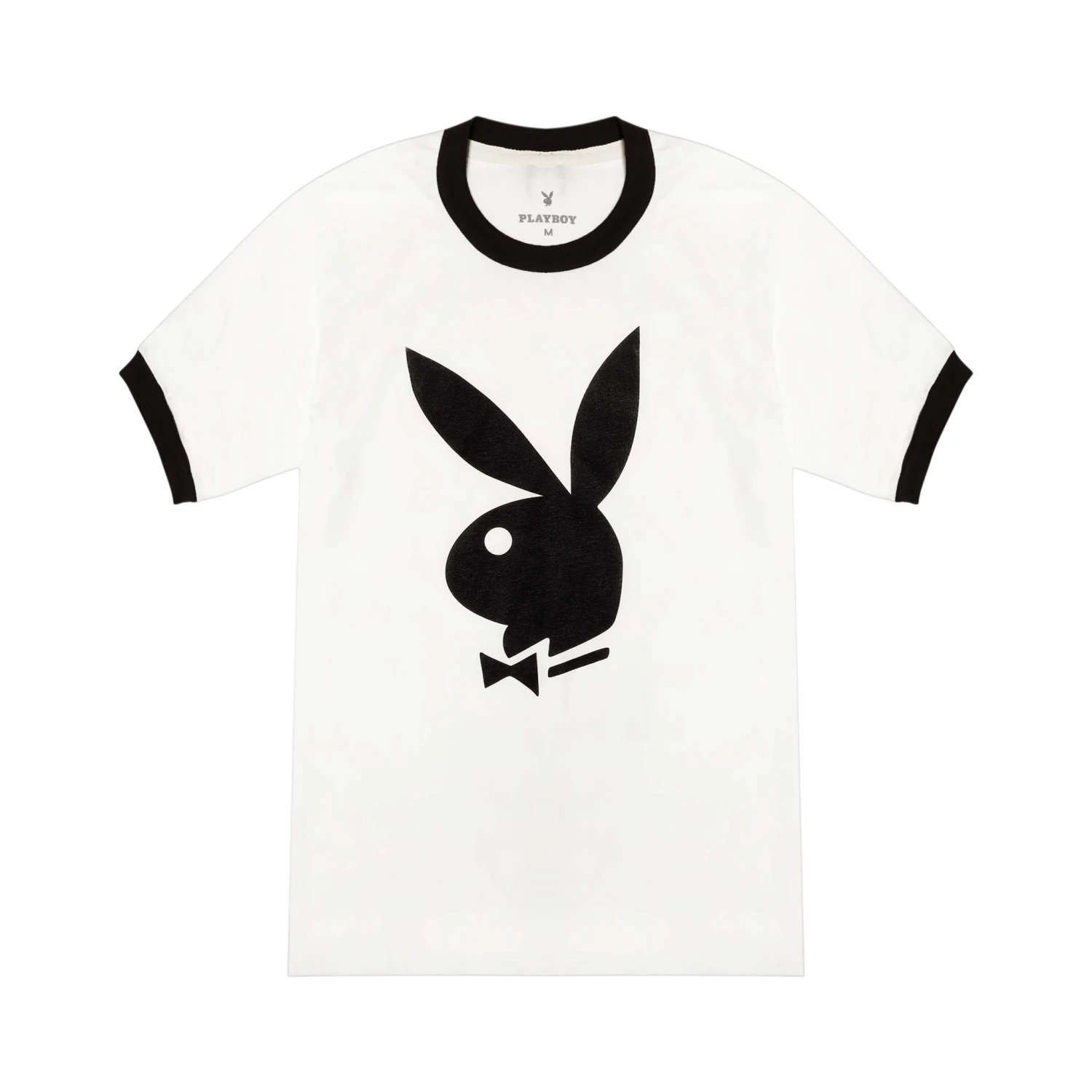 - Iconic Rabbit Head Logo: Strategically placed at the chest, it’s the symbol of Playboy elegance, featured prominently on this classic ringer t-shirt.