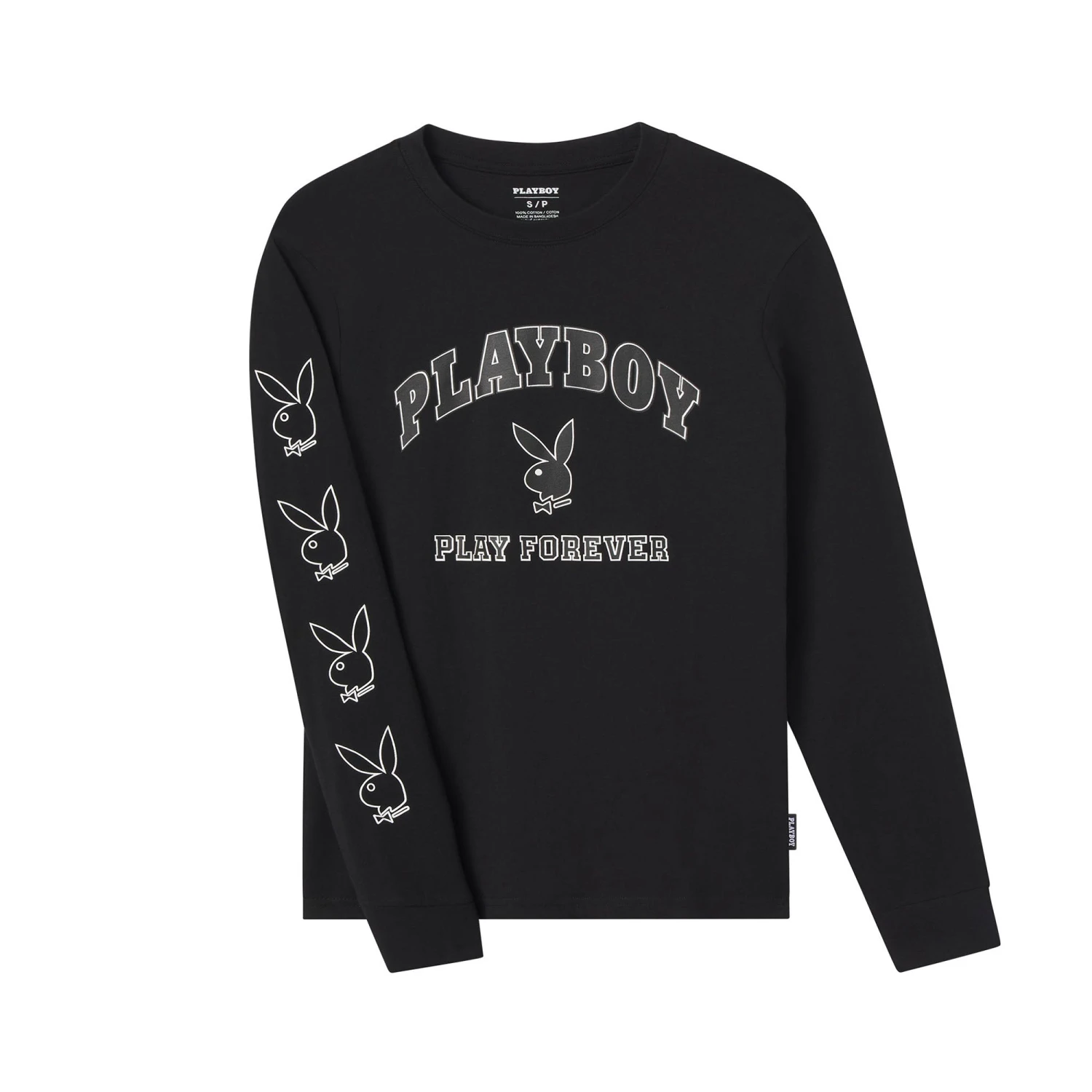 Hop on the varsity trend train, Playboy style. This top features a crew neckline, front and sleeve graphics (“Playboy, Play Forever”) and long sleeves.