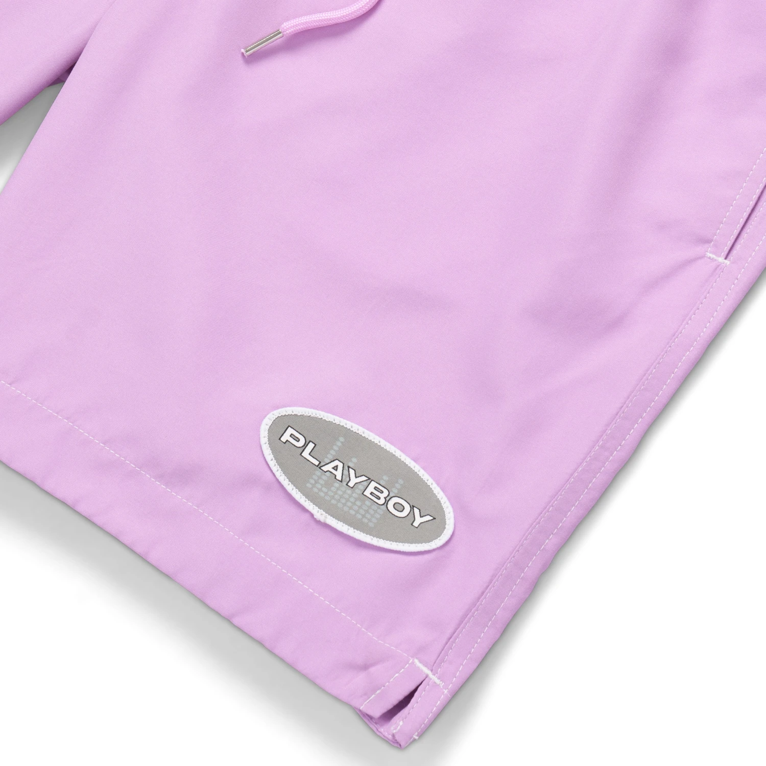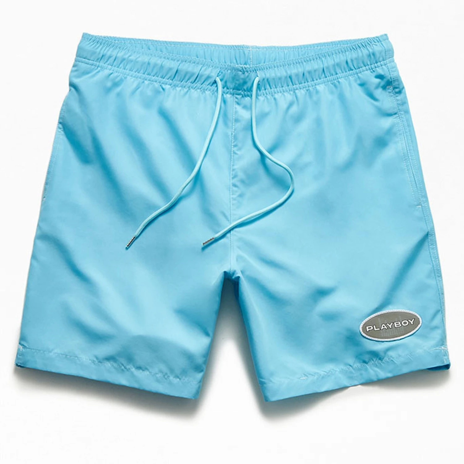 This pair of swim shorts features an elastic stretch waistline, adjustable drawstrings, side pockets, a welt back pocket, a solid color design, and a small logo at the hem.