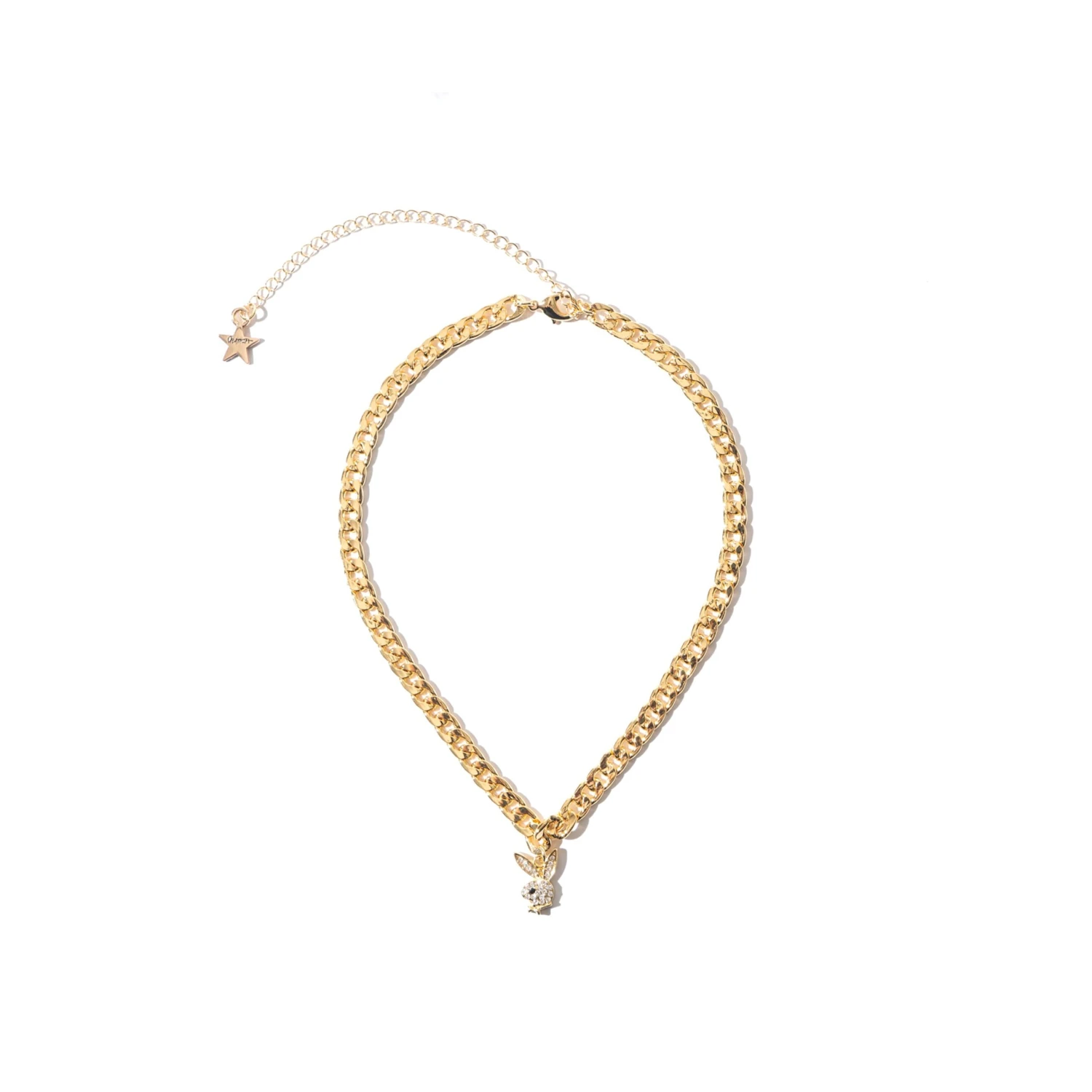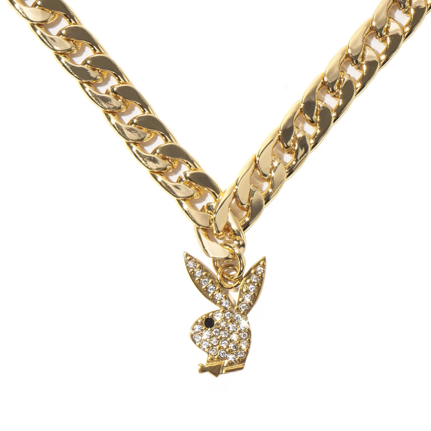 Introducing the Playboy Dalmata necklace. Worn by Travis Scott in the iconic Fall 2019 issue of Playboy featuring Kylie Jenner. This Playboy bunny necklace showcases the creative designs of jewelry designer Dalmata. Our stunning herringbone link chain connects to our crystal-studded Playboy Rabbit Head pendant.Â