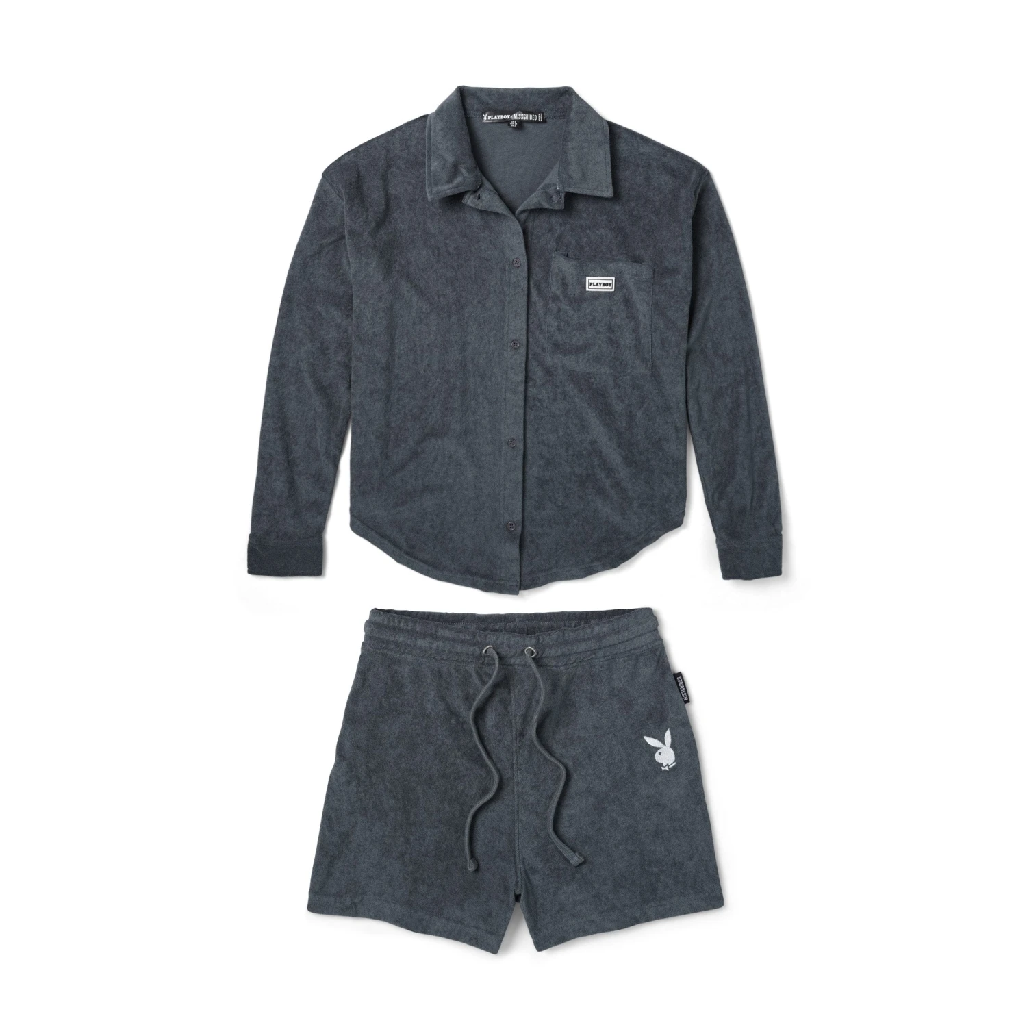 Embrace tranquility and style in one package. Click to order your Playboy Women’s Lounge Oversized Shirt and Short Set now.