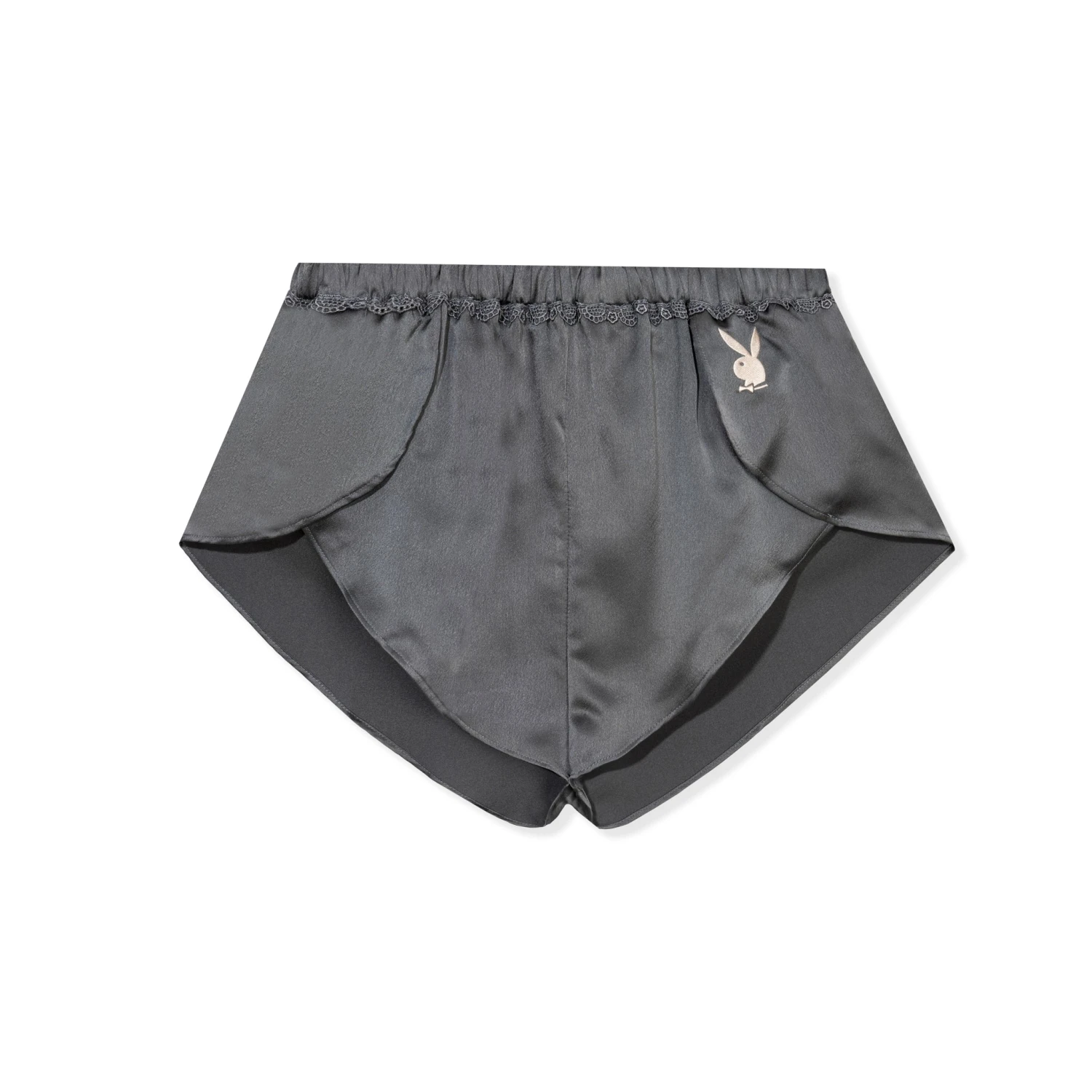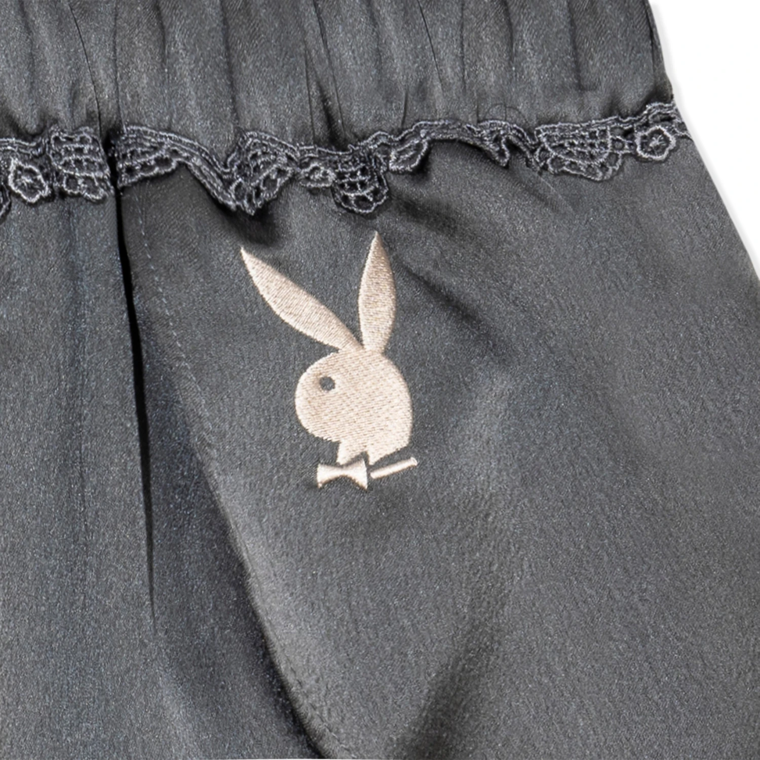 Elevate your evening routine with the Women’s Lounge Satin Cami & Short Set in Grey from Playboy. This exquisite set combines luxury with comfort, ensuring your nights and mornings are enveloped in softness and elegance. Designed with a keen eye for detail, this set features a strappy v-neck cami adorned with the iconic Playboy logo embroidery, and lace-trimmed shorts that add a touch of sophistication to your sleepwear collection.